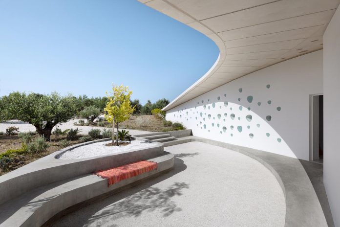 The house is located on the top of a hill which provides vistas towards the bay of Schiza and Sapientza as well as mountain views towards the east. โThe height of the house is limited to the tip of the olive trees to enable its integration with the surrounding landscape.โ