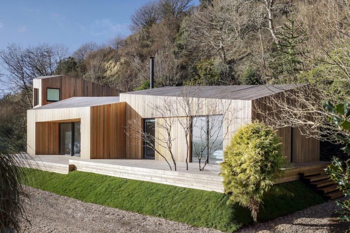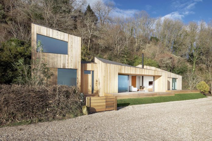 The design concept starts as a traditional cabin-like-form that then splits, twists and rotates, resulting in four pods. The outcome is a beautifully haphazard rough-sawn larch clad house that silhouettes against the wooded backdrop. The clearly defined entrance pod, the smallest of the four, guides you through the hallway into the central pod; the main living space comprising of kitchen, dining and living room.